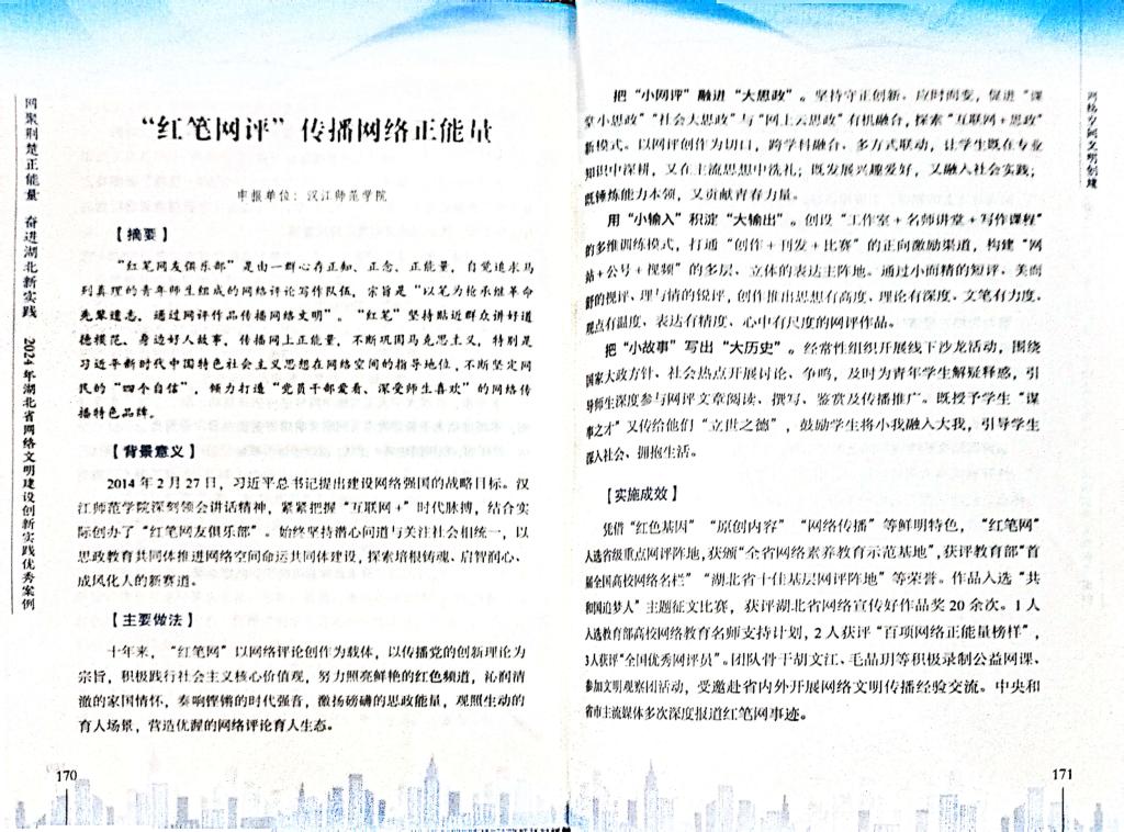 10月11日,2025年湖北省网络文明宣传月启动仪式在武汉举行。启动仪式上,省委网信办发布了湖北省网络文明建设创新实践突出案例,对50个案例进行通报表扬。汉江师范学院培育、申报的网络空间文明创建案例《“红笔网评”传播网络正能量》榜上有名。