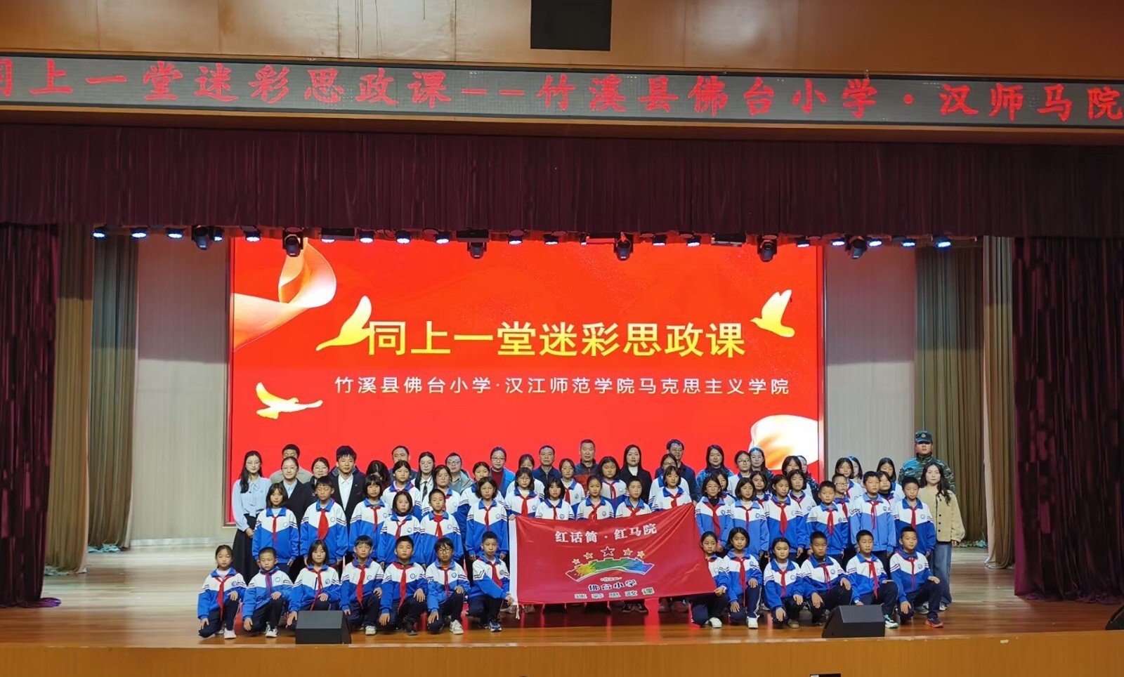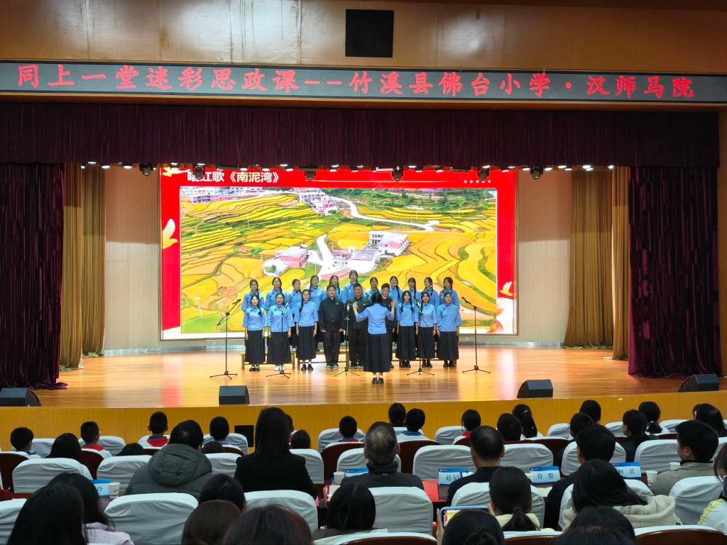 宣讲红色故事、代言美丽家乡、展现青春担当……10月25日上午,由我校马克思主义学院、竹溪县佛台小学联合举办的“同上一堂迷彩思政课”在南风剧场开讲。大学生、小学生携手,结合视频、图片、音乐、场景再现表演等创新形式,同上一堂生动有趣的思政课,共同推进大中小学思政教育一体化建设,为落实“时代新人铸魂工程”搭建起生动实践平台。