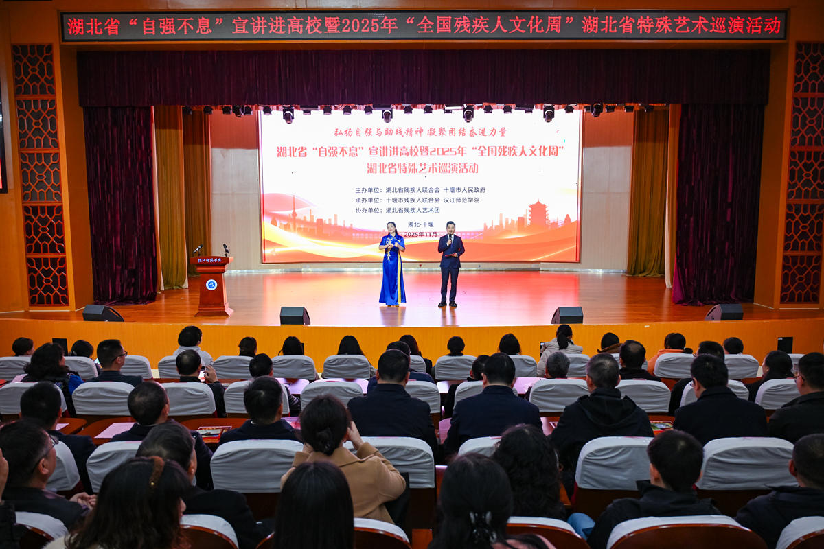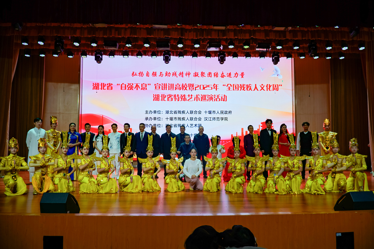 11月25日,湖北省“自强不息”宣讲进高校暨2025年“全国残疾人文化周”特殊艺术巡演活动在我校南风剧场圆满举行。活动由省残联、十堰市政府主办,我校与十堰市残联承办,湖北省残疾人艺术团协办。省残联二级巡视员易宁、我校党委书记付永昌、十堰市政府副秘书长陈勇、市残联党组书记、理事长鲁斌等出席活动。