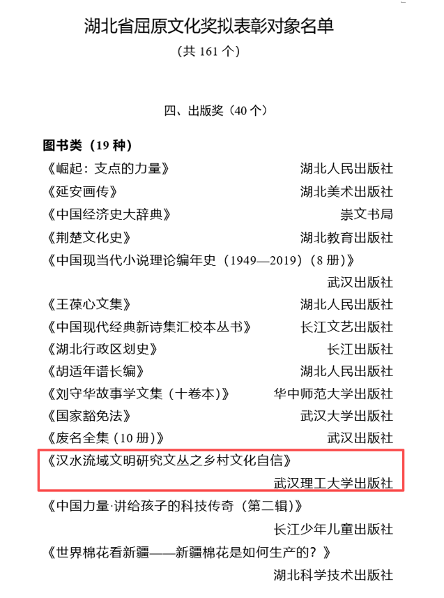 近日,《中共湖北省委湖北省人民政府关于表彰湖北省屈原文化奖的决定》印发,由湖北省高校人文社会科学重点研究基地汉江师范学院汉水文化研究基地主任潘世东教授担任总主编,我校潘世东、王道国教授、何道明副教授、潘龚凌子、冷静讲师等担任主要著者,武汉理工大学出版社出版的“十四五”国家重点图书《汉水流域文明研究文丛之乡村文化自信》喜获湖北省屈原文化奖。