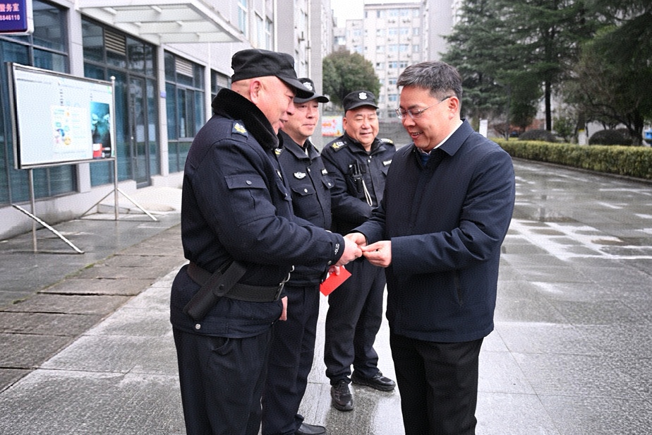 付永昌一行先后来到集贤楼总值班室、学校办公室、视频监控中心、上海路大门等校内值班岗点。每到一处,付永昌都与值班人员亲切握手、互致问候,并送上节日慰问品。他详细询问了各岗位的值班安排和运行情况,现场检查了安保设备与后勤保障设施的运行状态,叮嘱大家要时刻绷紧安全弦,以“一马当先”的责任感站好岗、守好责,全力确保校园在春节期间的安全、稳定与祥和。