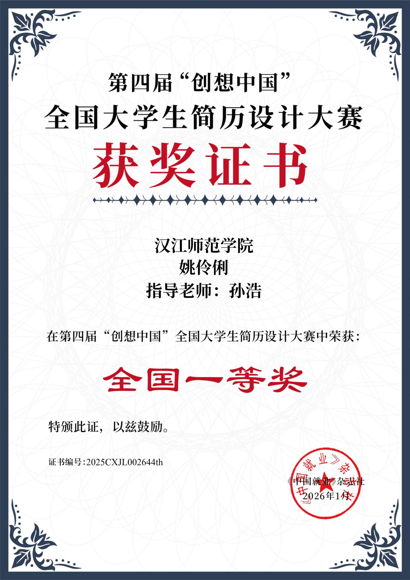 近日,第四届“创想中国”全国大学生简历设计大赛圆满落幕。我校历史文化与旅游学院历史学专业2301班姚伶俐同学在孙浩老师指导下,凭借专业扎实、创意鲜明的简历作品,从全国众多高校参赛者中脱颖而出,荣获全国一等奖,充分展现了我校学生良好的职业素养与创新能力。