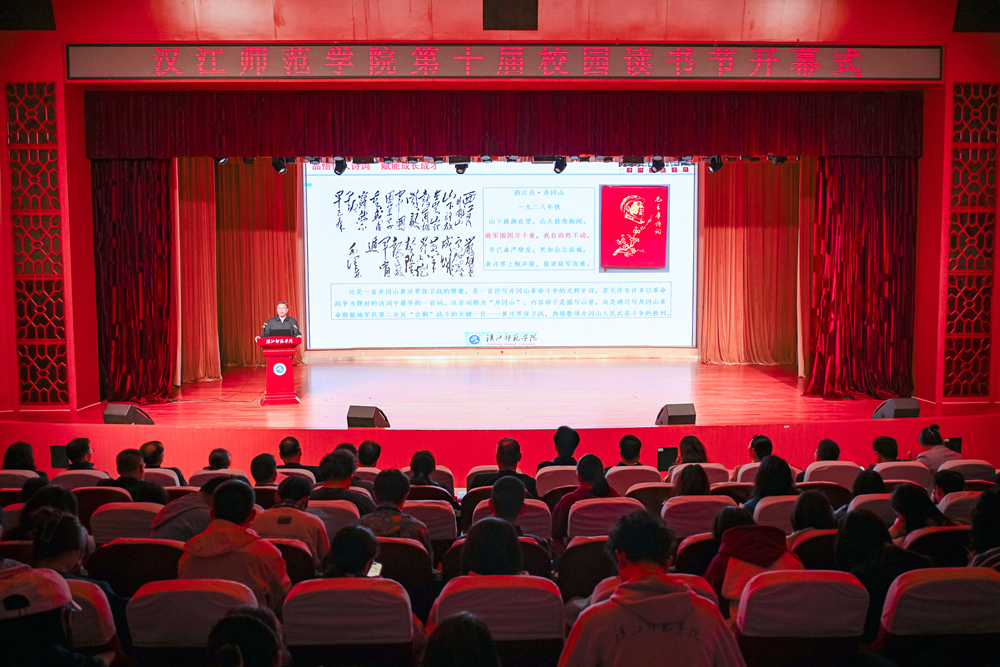 吴红斌致开幕辞。他指出,2026年是《全民阅读促进条例》实施的第一年,也是学校“十五五”规划开局起步、全力推进申硕攻坚的关键之年。他希望青年学子以读书坚定信仰,在研读经典中筑牢精神之基;全体师生以读书增长才干,在深学细悟中夯实立身之本;活动组委会以读书节营造良好氛围,在服务发展中彰显汉师之为。