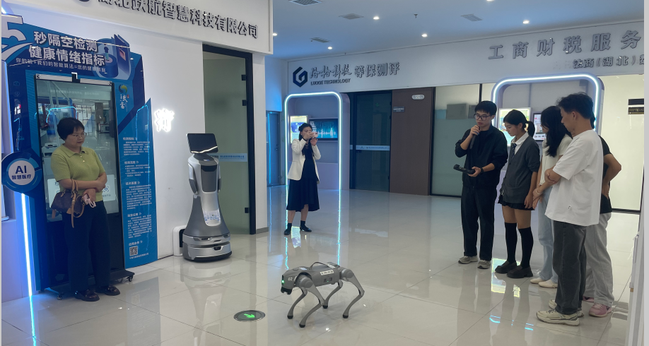 走进产业园,充满科技感的展厅瞬间抓住了大家的目光。智能机器狗灵活地在地面穿梭并做出跳跃等高难度动作,各种型号多用途的无人机展示着人工智能在机器人领域的突破。在“智慧城市”“武当云谷”“数字时代”等展区,各类前沿数字设备与技术应用让同学们叹为观止。不少同学在工作人员的指导下,亲手操作,体验人机交互的乐趣。