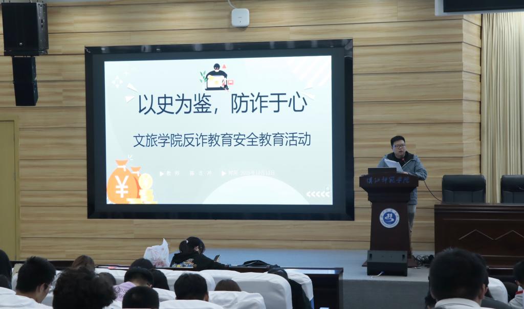 10月13日晚8时,历史文化与旅游学院在崇文楼C101报告厅举办反诈安全教育主题大会。辅导员陈吉冲老师面向2025级全体学生,以近期校园内发生的真实诈骗案例为切入点,深入拆解诈骗手法,引导学生完成从“轻视为笑谈”到“警醒深反思”的认知转变,助力筑牢校园防诈心理防线。