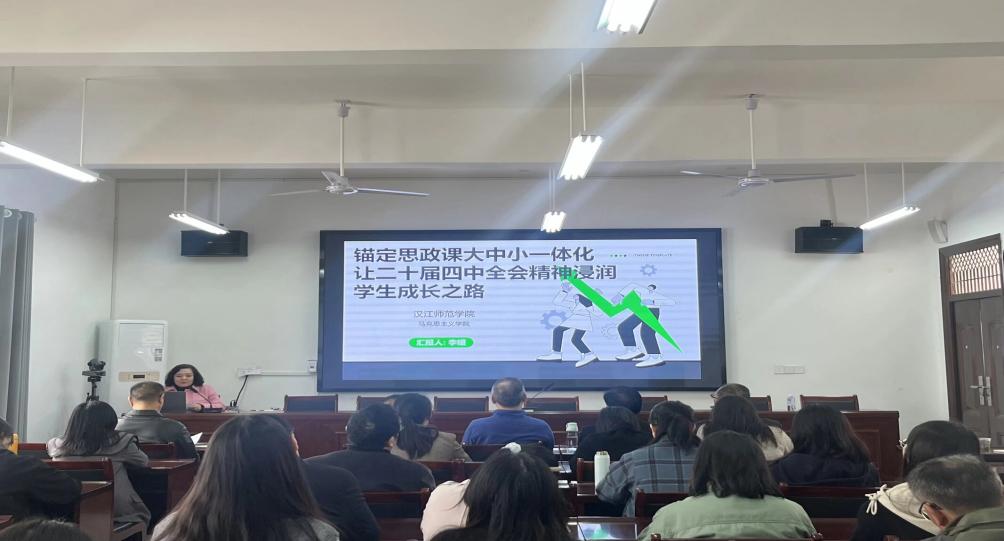 马院教师李媛以“锚定思政课大中小一体化,让党的二十届四中全会精神浸润学生成长之路”为题,从锚定一体化根基—构建“三阶递进”的顶层逻辑、分层落地实践—各学段教学方法创新与案例深耕、筑牢一体化保障—打通“协同育人”的关键堵点等三个方面展开具体的讲解。