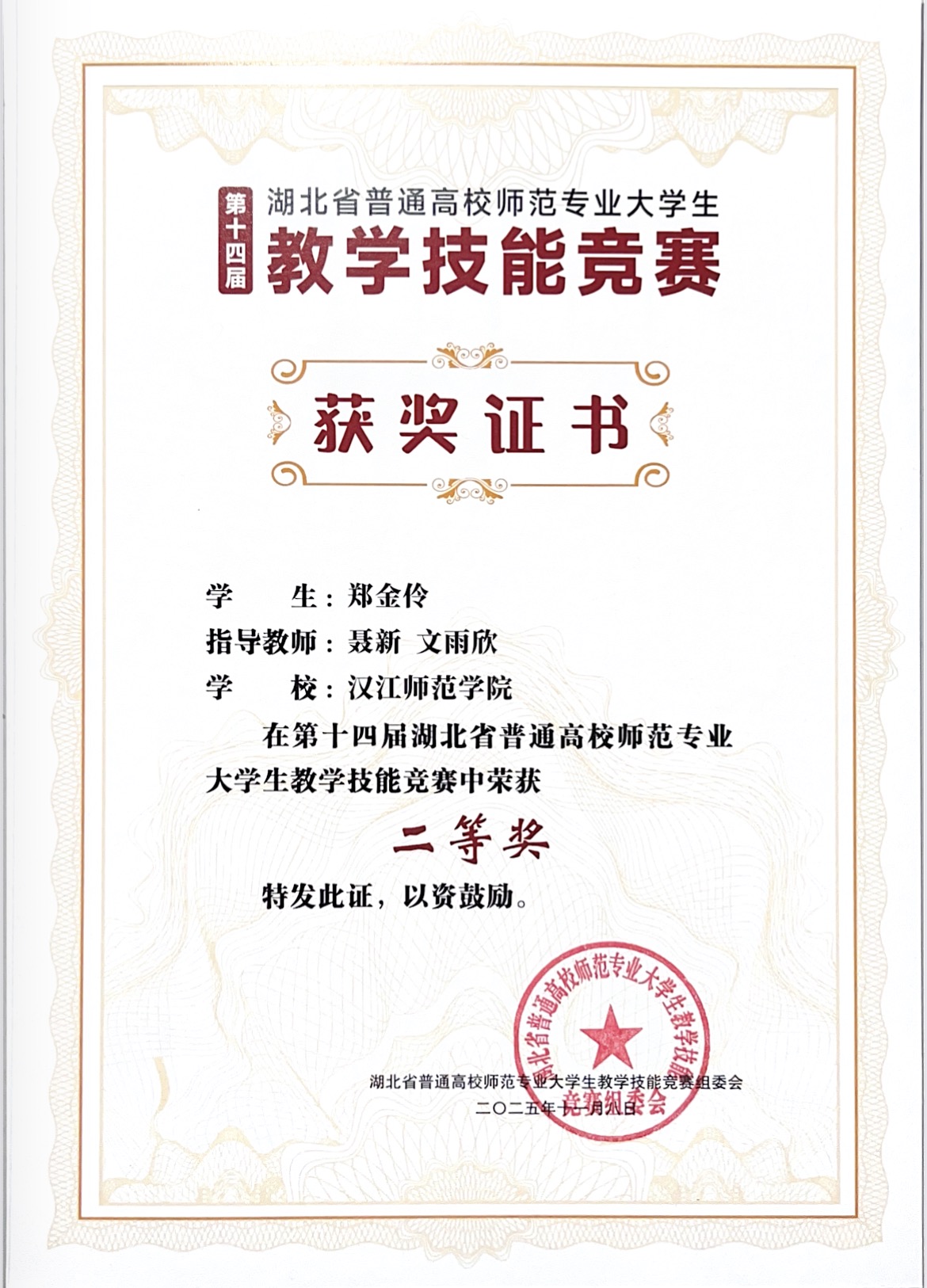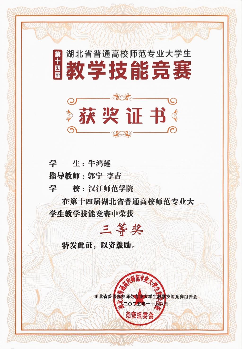 11月8日,由湖北省教育厅指导、华中师范大学承办的第十四届湖北省普通高校师范专业大学生教学技能竞赛在华中师范大学圆满落下帷幕。在聂新老师、孙浩老师、文雨欣老师、十堰市郧阳中学魏楚楚老师的共同指导下,我校历史文化与旅游学院历史学专业的郑金伶同学从激烈的竞争中脱颖而出,进入到现场总决赛,最终荣获二等奖的优异成绩;另一位牛鸿莲同学在郭宁老师和十堰市东风第七中学李吉老师的指导之下,获得三等奖。