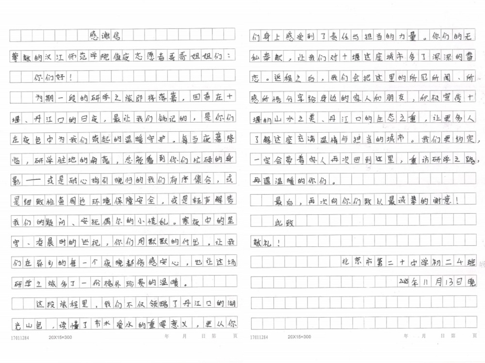 近日,我校收到了来自北京第二十中学学生、十堰市南水北调区域协作中心的感谢信。信中,北京二十中学学子对丹江口校区学生志愿者在夜间值班值守志愿服务中的出色表现给予高度认可与热烈赞扬,同时十堰市南水北调区域协作中心对我校一直以来对京堰对口协作工作的大力支持和配合表示衷心的感谢!