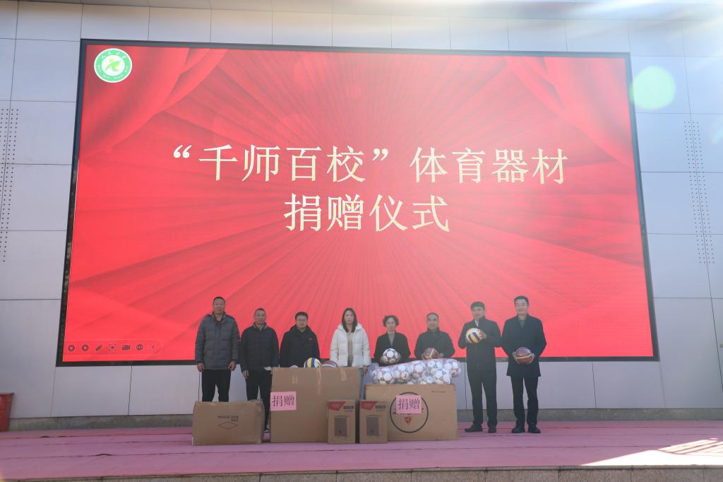 分享结束后,现场举行了简洁而庄重的“千师百校”体育器材捐赠仪式。汉江师范学院体育学院带来的篮球、足球、排球、田径训练器械等器材被整齐陈列,这些器材将有效补充学校体育教学物资,为孩子们开展多样化体育活动提供有力保障。