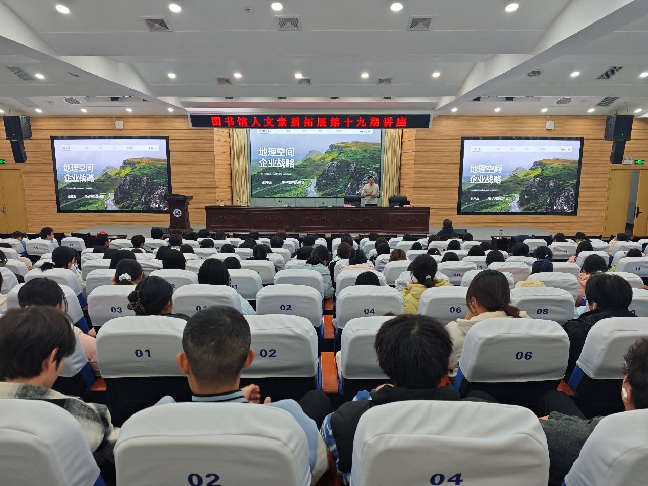 11月25日晚,图书馆第十九期人文素质拓展讲座在崇文楼C101举行。经济与管理学院博士张伟玉老师讲授了《地理空间企业战略》专题讲座。200余名师生认真聆听了讲座。