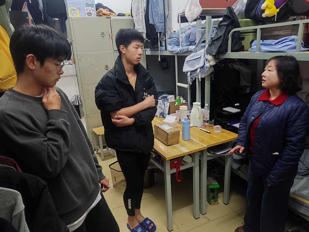 12月8日晚,体育学院分党委书记、春雪楼功能型党总支副书记陈露、四支部书记金超老师和学生一起整理清洁宿舍卫生。