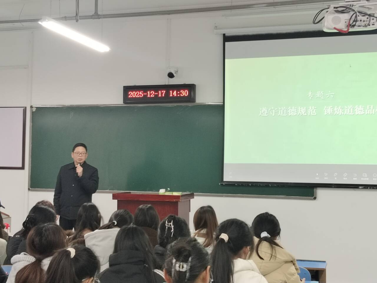 12月17日,汉江师范学院党委常委、统战部部长王进走进课堂,以《思想道德与法治》第五章“社会主义道德的核心与原则”为主题,为经济与管理学院2025级本科生讲授专题思政课。课程紧扣“人为什么需要道德”“社会主义道德的先进性”两条主线,紧密结合经济与管理专业人才培养需求,引导学生深度领会社会主义道德的丰富内涵与实践要求。