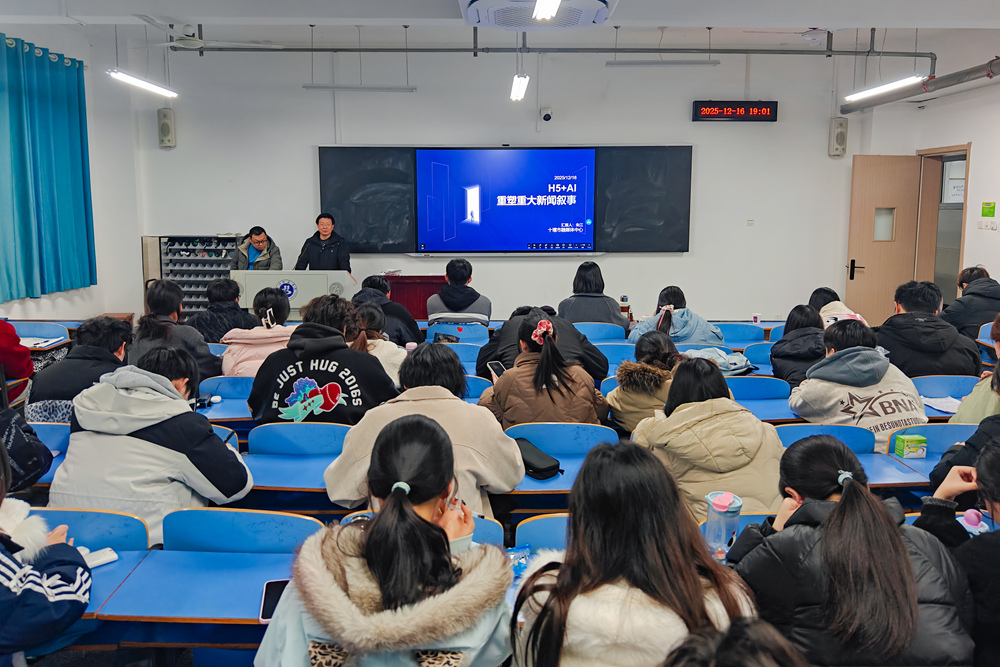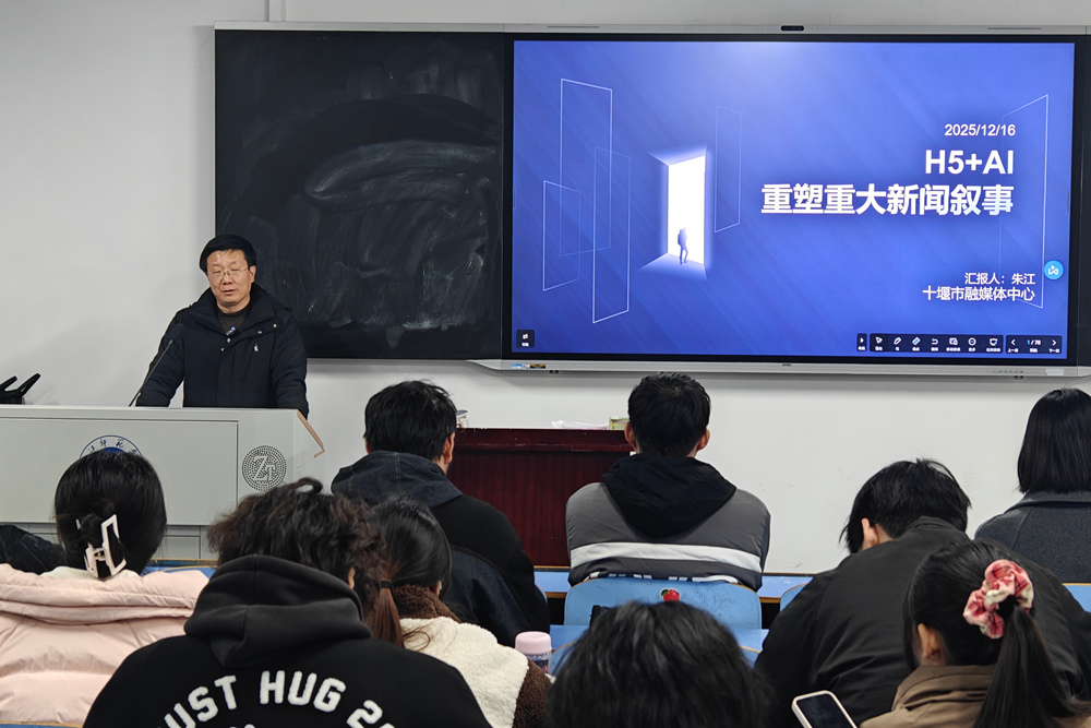 12月16日晚,十堰市融媒体中心高级记者朱江老师应邀来校,在崇文楼A510教室开展题为《H5+AI重塑重大新闻叙事》的专题讲座。讲座通过丰富案例与深度解析,系统呈现了技术赋能下新闻作品的创新形态与人文价值,为师生带来媒体融合领域的前沿思考。