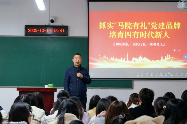 12月19日下午,学院在文科楼A313举行党的二十届四中全会精神专题宣讲暨“马院有礼”党建品牌宣讲。学院党委书记夏金元担任主讲人,以“青春逐梦现代化 挺膺担当强国路”为主题,为在场参与的学生党员、青马班学员、2025级班导生、25级辩论队的同学们带来了一场兼具理论深度与实践指导意义的辅导报告,推动全会精神、学院党建品牌入脑入心。
