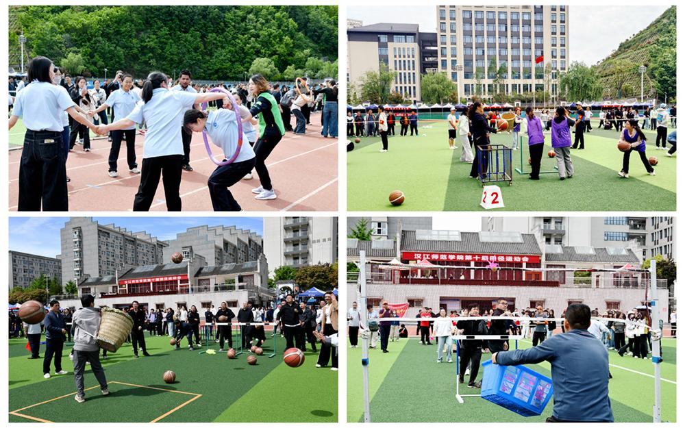 本次趣味竞赛共设三个项目,分别为“一圈到底”“背篓投篮”和“硕果累累”。在“一圈到底”环节中,参赛教职工手拉手排成一圈,通过身体柔韧性与团队节奏的同步配合,将呼啦圈依次传递。只见大家或躬身跨越,或侧身翻转,动作灵活有趣,现场笑声不断,气氛轻松热烈。“背篓投篮”项目则考验投掷与接应的配合。投掷者需精准计算抛物线,接球队员则灵活调整背篓位置,其余队员迅速捡球,形成投、接、捡无缝衔接的流畅配合,展现出极高的团队默契。每当有精彩接球,现场便爆发出阵阵喝彩。在“硕果累累”项目中,教职工们通过毽球投掷与接筐的连续动作,完成了“跑动—投掷—接筐”的完整链条。每一次成功的接球都引来阵阵欢呼,场面热烈而有序,充分展现了参赛者的协调应变能力。