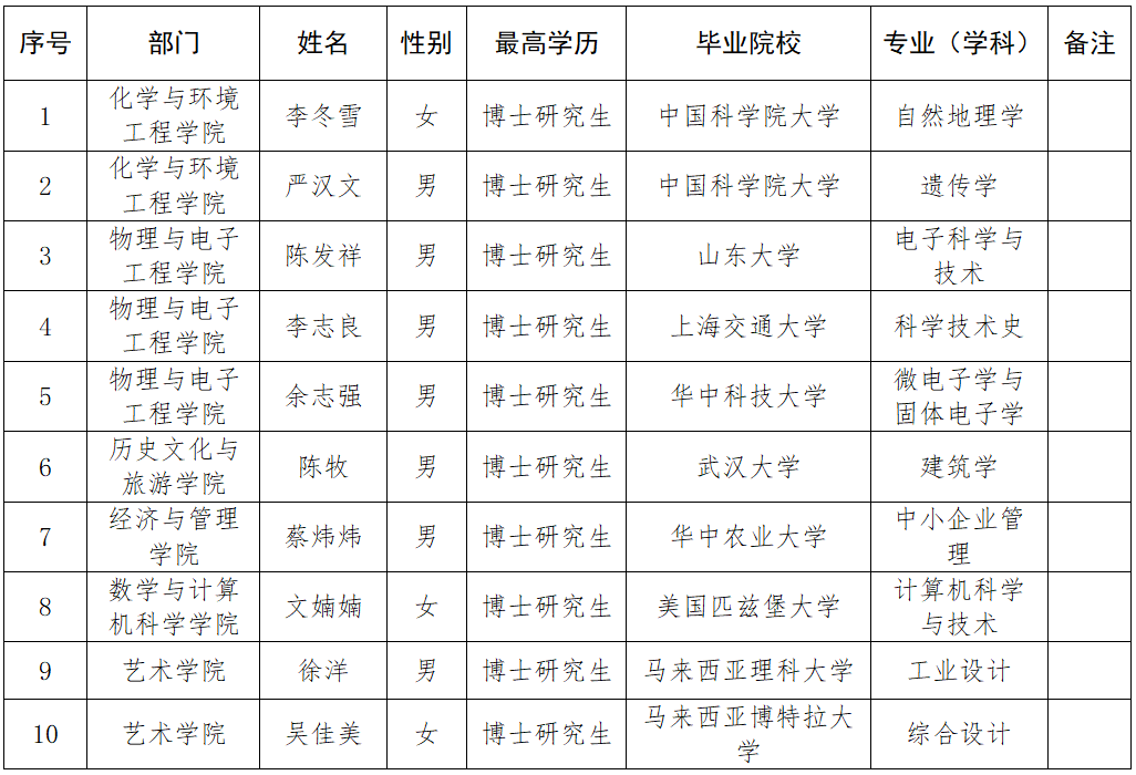 根据省人社厅有关政策和规定,依照《汉江师范学院高层次人才引进管理办法》要求,经资格审查、面试、考察、心理测试、体检等环节考核,学校研究拟聘用博士10人,名单如下。