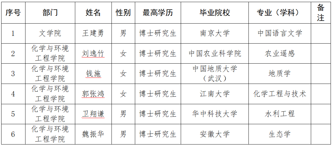 根据省人社厅有关政策和规定,依照《汉江师范学院高层次人才引进管理办法》要求,经资格审查、面试、考察、心理测试、体检等环节考核,学校研究拟聘用博士6人,名单如下。
